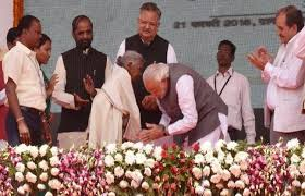 • The Prime Minister, who was in Chhattisgarh to launch the ambitious Shyama Prasad Mukherjee Rurban (rural-urban) Mission, felicitated Kunwar Bai from Kotabharri village of Dhamtari and then touched her feet to seek blessing.