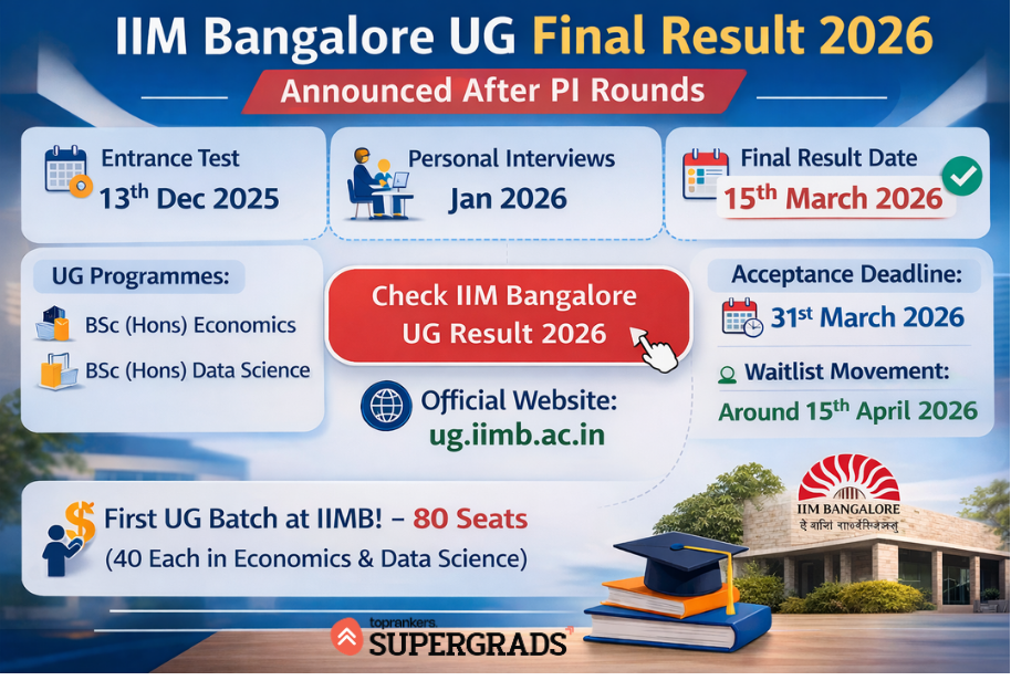 Overview: IIM Bangalore has released the IIM Bangalore UG Final Result 2026 after the completion of the personal interview round for admission to its new undergraduate programmes. As per the official admission schedule, the IIMB UG Admissions Test was held on 13 December 2025, interviews were conducted in January 2026, and final offers were scheduled to be released by 28 February 2026. Candidates can check their admission status through the official UG admissions portal. Read on for the direct link, important dates, and next steps.