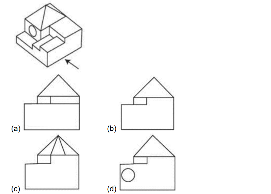 2) The question figure shows the 3D view of an object. Identify the correct view looking in the direction of arrow.