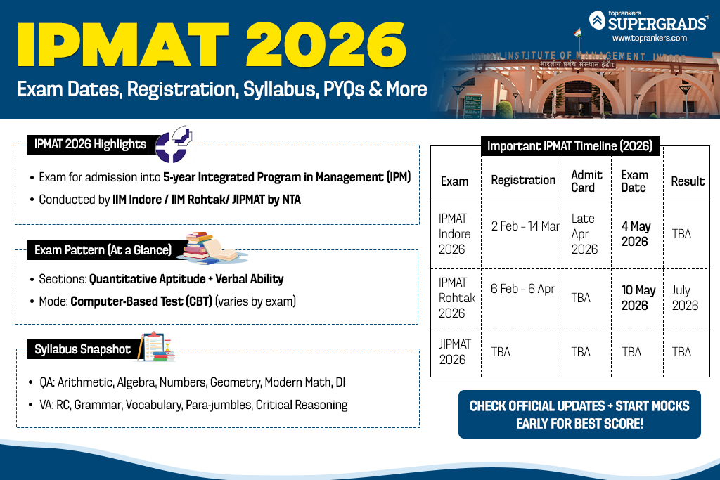 What You'll Learn: On this page, you’ll find the latest IPMAT 2026 exam dates, eligibility rules (Indore/Rohtak/JIPMAT), exam pattern, syllabus, preparation strategy, previous year papers, cut-off trends, and the step-by-step admission process. Bookmark this page—we update it immediately when the official registration, admit card and result timelines are released.
