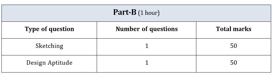 Part-B consists of TWO questions to test the candidates’ drawing skills and design aptitude. This will require subjective evaluation. The questions in Part-B will be displayed on the computer screen, and the answer must be written/drawn in the answer book. In the case of PwD candidates availing the use of a scribe, assistance in attempting Part-B is not permitted, as the question is aimed at evaluating their drawing skill.