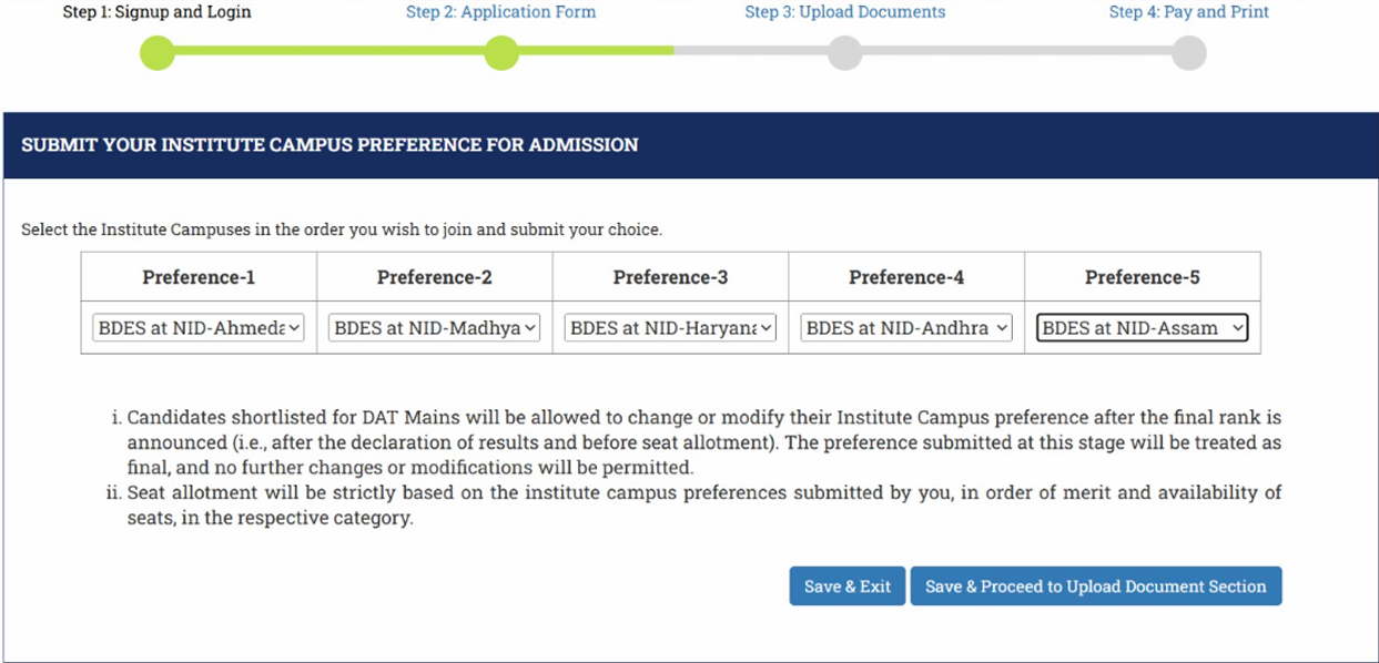 The application form will ask you to indicate campus preference(s). This is usually an ordered list where you rank the campuses by priority (for example: Ahmedabad, Gandhinagar, Bengaluru, and so on). You'll be required to fill 5 preference in order of your choice.