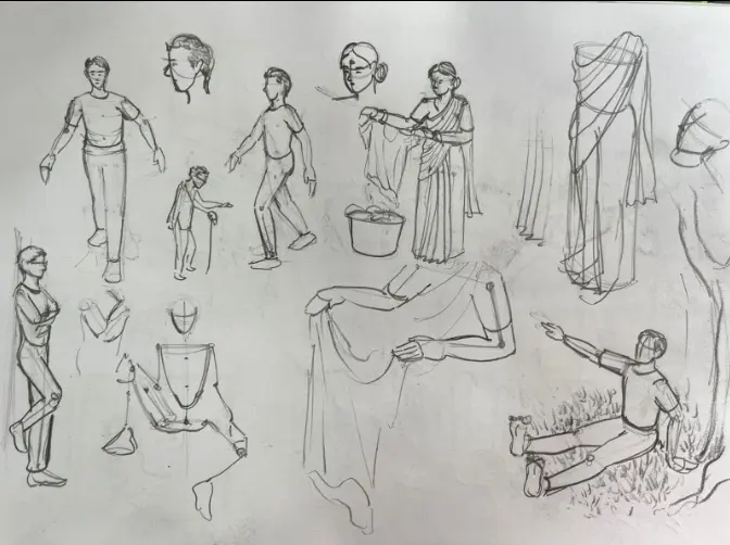 Q.3. Draw human figures in action showing different profiles, front view, side view and back view- performing various everyday activities like walking, running, bending, or lifting.