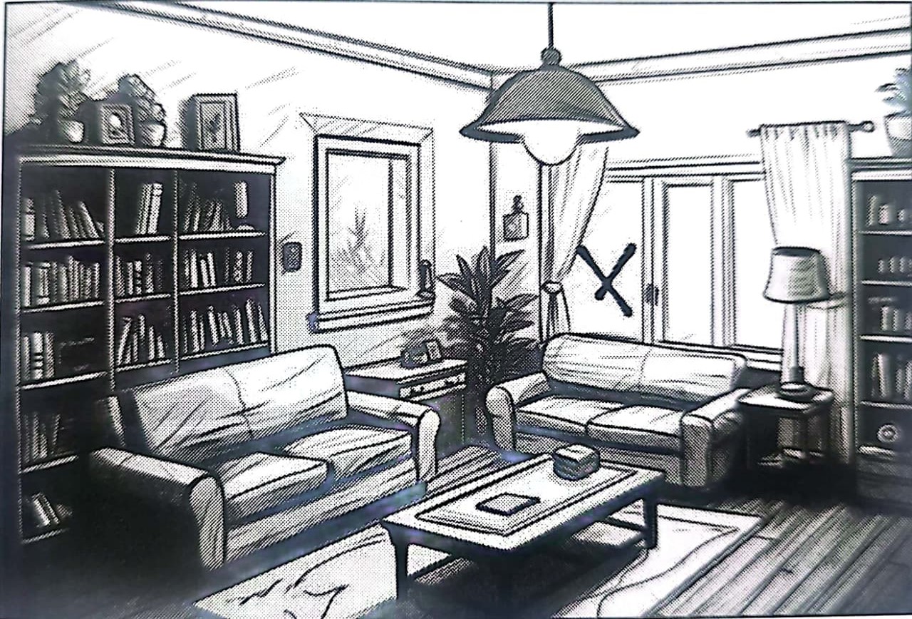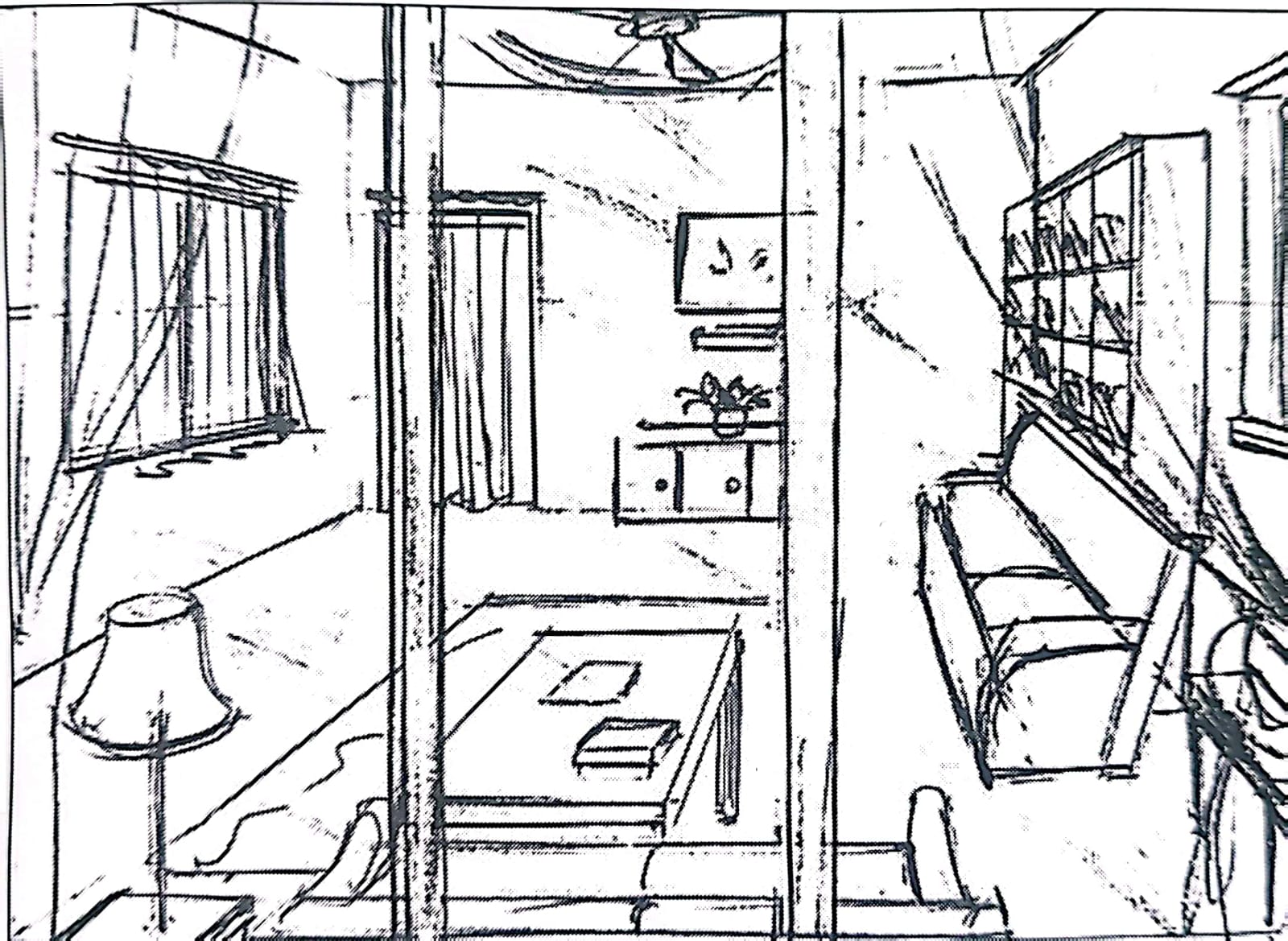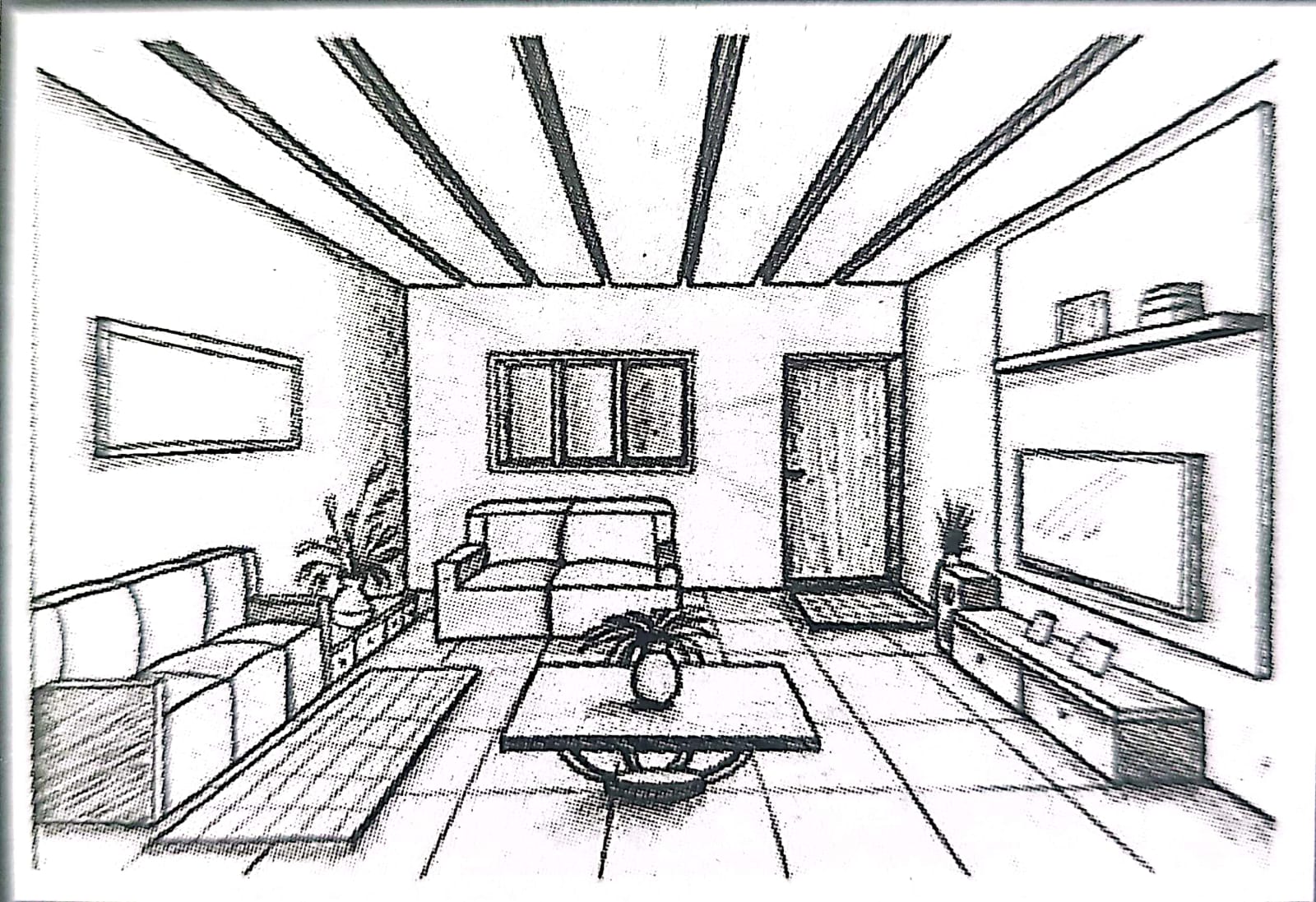 3. Sketch a study room showing a desk facing the window. Use single-point perspective.