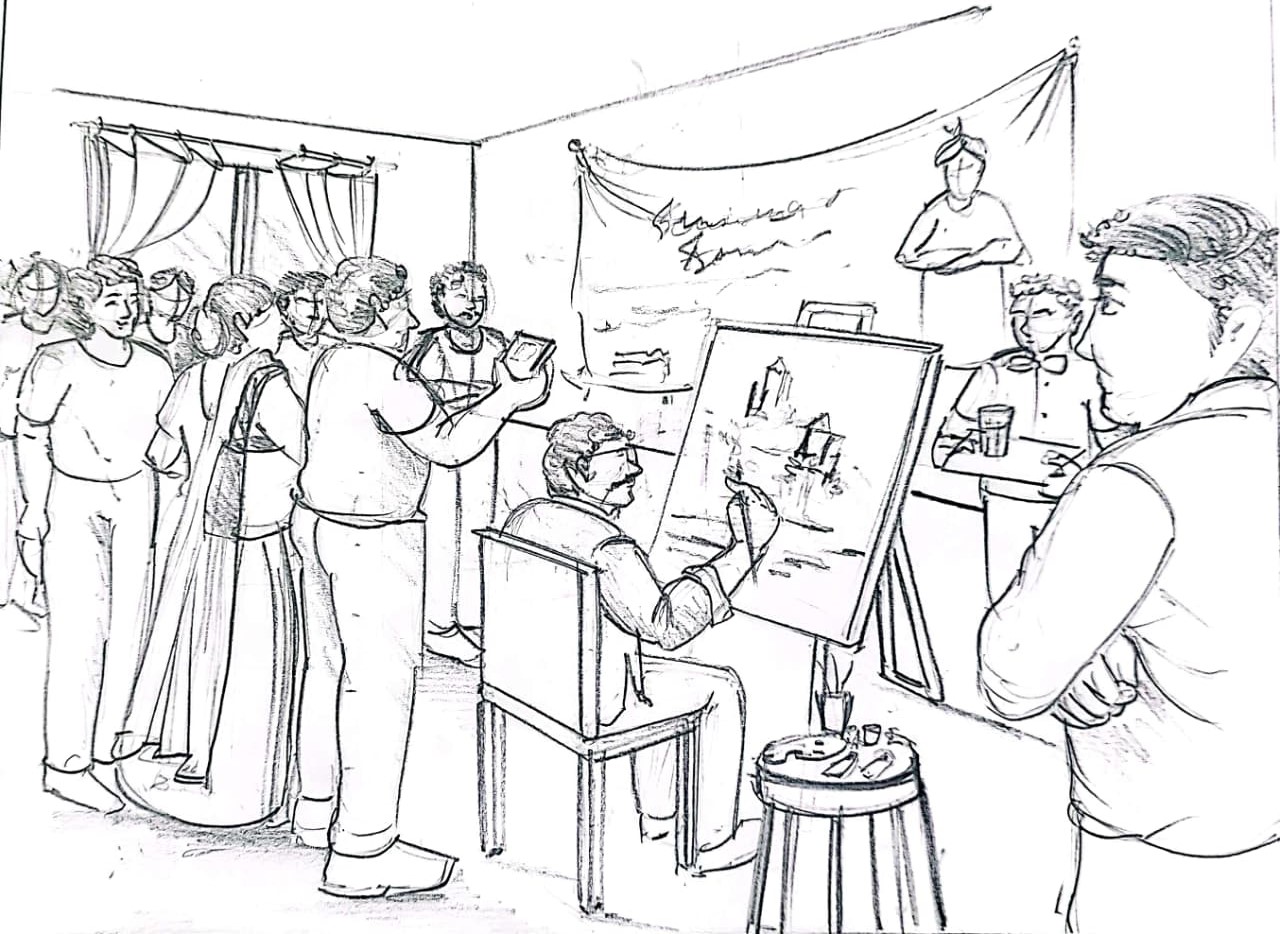 2. Draw a two-point perspective scene showing an art exhibition or live painting session. Depict a person working on a canvas and a crowd discussing artworks in exhibition. You are a part of this crowd and observing the scene. Include elements like furniture, display setup, and lighting to enhance the realism. Draw from a two-point perspective.