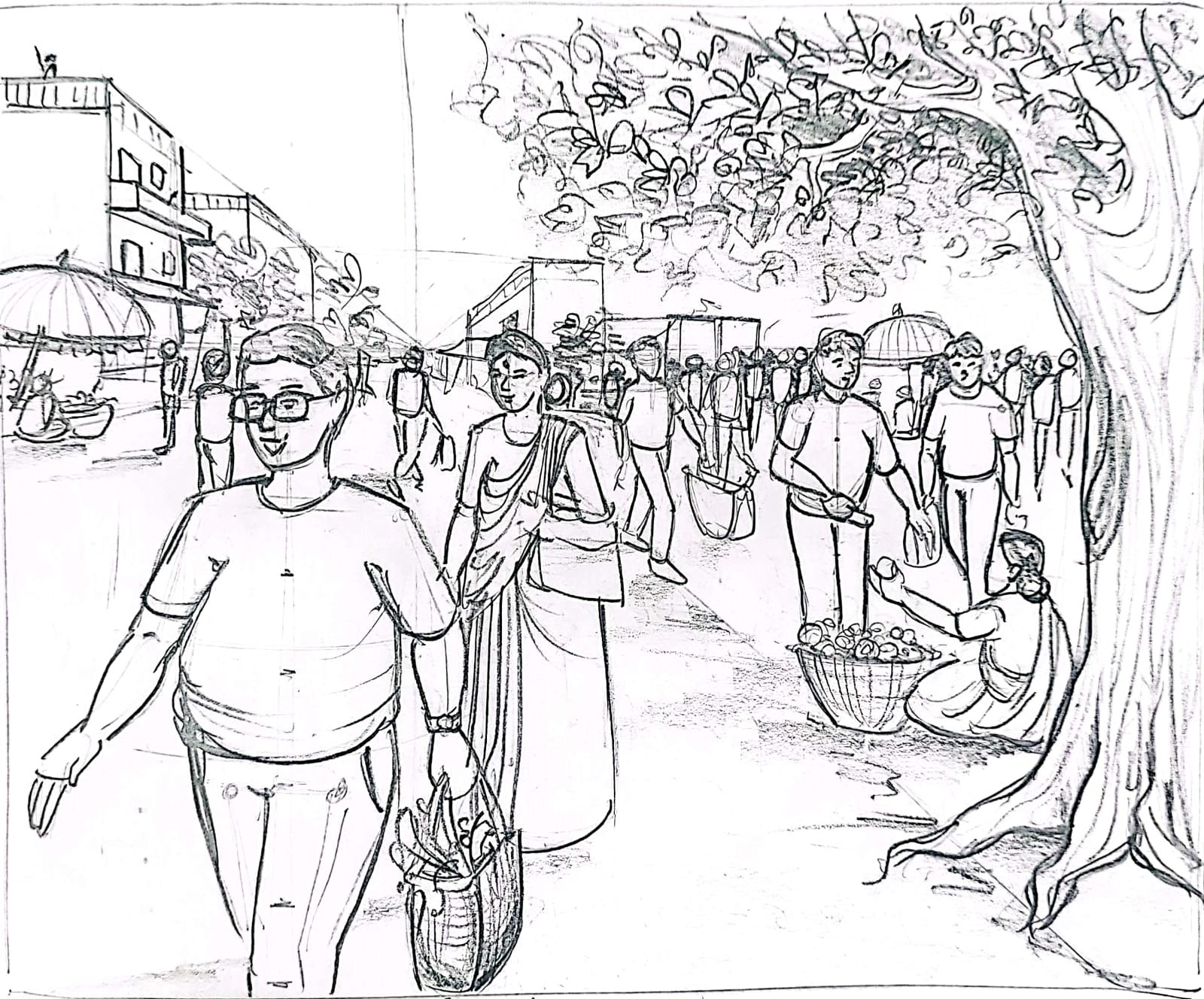 1. Draw a busy street market scene using one-point perspective. Show people walking, vendors selling goods, and surrounding elements like trees, stalls, and buildings that give a sense of depth and daily life.