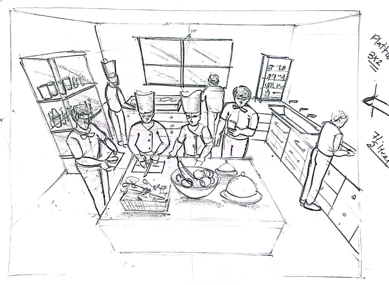 3. Draw a three-point perspective view of a professional kitchen where multiple chefs are busy preparing food. Include realistic details like cooking counters, utensils, wall shelves, and people engaged in different tasks.