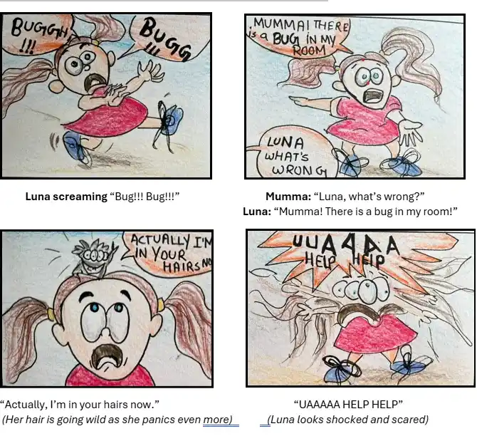 2. One day, Luna saw a bug in her room and screamed in panic. As she ran around shouting, the bug sneakily landed in her hair! Luna freaked out even more, calling for help. Her mom rushed in, confused, while Luna kept yelling about the creepy intruder in her hair! Frame a story in 4 frames also mention the title and moral of the story.