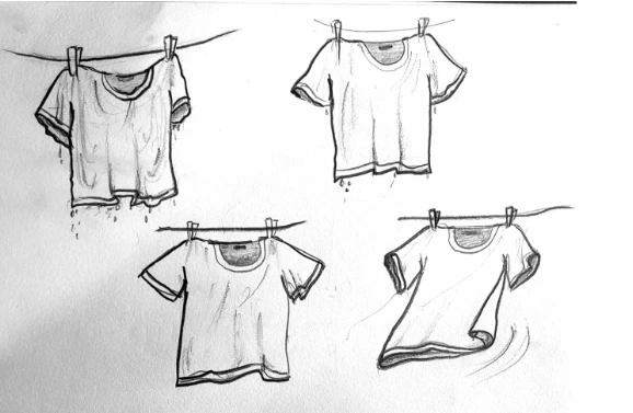 5. Show the process in 4 different steps. Drying a t-shirt on clothesline - wet to dry.