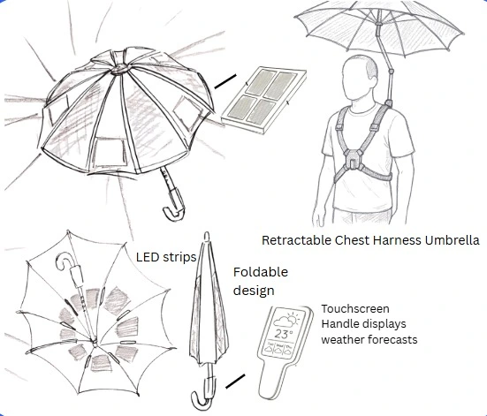 Your task: Design an umbrella without a traditional handle that solves this problem while remaining functional in heavy rain.