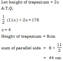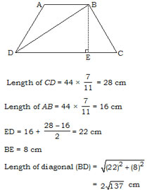 The area of an isosceles trapezium is 176 cm2  and height is \(\cfrac{2}{11}\) th of the sum of its parallel sides. If the ratio of the length of the parallel sides be 4 : 7, then the length of the diagonal is –