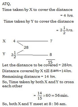 A train X leaves Howrah at 6 a.m. and reaches Asonsol at 10 a.m. Another train Y leaves  Asansol at 8. a.m. and reaches Howrah at 11 : 30 a.m. The two trains cross each other at  –