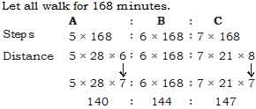 Time taken by A to take 5 steps is equal to time by B to take 6 steps and by C to take 7 steps. But distance covered in 6 steps of A are equal to 7 steps of B and 8 steps of C. Ratio of their speed is –