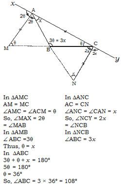 In an obtuse angle ∆ABC the external angle bisector of A intersect the extended part of line CB at M and the external angle bisector of C intersect the extended part of line AB at N. MA = AC = CN, then find B?