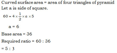 If the slant height of a right pyramid with square base is 5 metre and the curved surface area is 60 m2, then the ratio of total slant surface and area of the base is –