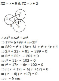 X and Y are centres of circles of radii 9 cm and 2 cm respectively, XY = 17 cm. Z is the centre of a circle of radius r cm which touches the above circles externally. Given that \(\angle \)XZY= 90ยบ, the value of r is: