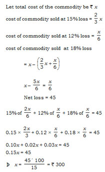 Two third of a commodity is sold at 15% loss, \(\cfrac{1}{6}\) sold at 12% loss, and rest at 18% loss. If the total loss in Rs. 45, then the value of the commodity is