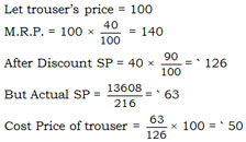 In a shop, trousers are sold at 40% above the cost price. During a sale, the shopkeeper offers a discount of 10% off the usual selling price. If he manages to sell 216 trousers for Rs.13,608, then his cost price per trouser is —