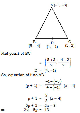 For triangle ABC, find equation of median AD if co-ordinates of A, B and C are (–1, –3), (5, –4) and (3, 2) respectively –