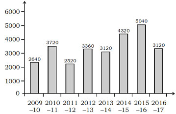 DIRECTIONS: Study the following bar-diagram carefully and answer the questions. The bar given below shows the foreign exchange reserves of a country (in million US $) from 2009-10 to 2016-17.