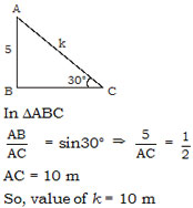 A person aims at a bird on top of a 5 m high pole with an elevation of 30°. If a bullet is fired it will travel k m before reaching the bird. The value of k (in m) is –