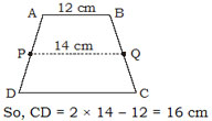 In a trapezium ABCD, AB || DC and P and Q are mid points of AD and BC respectively. If AB = 12 cm and PQ = 14 cm, then the length (in cm) of CD is –
