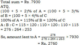A sum of Rs. 7930 is divided into 3 parts and given on loan at 5% simple interest to A, B and C for 2, 3 and 4 years respectively. If the amounts of all three are equal after their respective periods of loan, then A received a loan of –