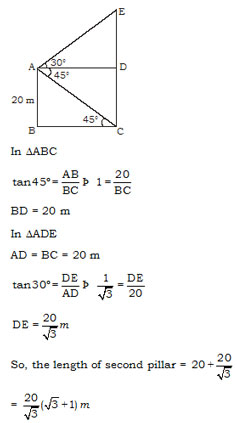 From the top of a pillar of height 20 m the angles of elevation and depression of the top and bottom of another pillar are 30° and 45° respectively. The height of the second pillar is –