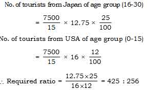 Find the ratio of the age group (16-30) from Japan to the age group (0-15) from USA, if the no. of tourists from France was 7500.