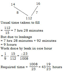 Two pipes can fill a cistern in 14 hours and 16 hours respectively. The pipes are opened simultaneously and it is found that due to leakage in the bottom, it took 92 min more to fill the cistern. When the cistern is full, in what time will the leak empty it?