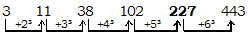 3, 11, 38, 102, ?, 443