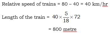 Two trains are running on parallel lines in the same direction at speeds of 80 kmph and 40 kmph respectively. The faster trains crosses a man in the second train in 72 seconds. The length of the faster train is –