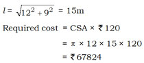 The radius of the base of a conical tent is 12m. The tent is 9 m high. Find the cost of canvas required to make the tent, if one square metre canvas costs Rs. 120 (Take \(\pi\) = 3.14)