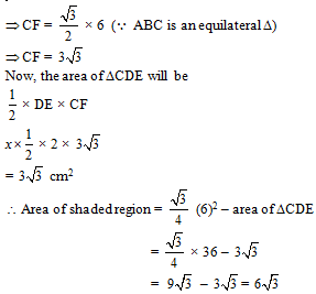 In the equilateral triangle ABC, AD = DE = BE, D and E lies on the AB. If each side of the triangle (i.e, AB, BC and AC) be 6 cm, then the area of the shaded region is: