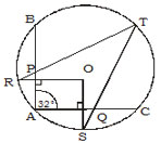 P and Q are the mid points of two chords AB and AC respectively of a circle with center O . OP and OL are produced to the point R and S, respectively such that they meet the circle. T is a point between R and S in the major arc. If BAC = 32º Find RTS =?
