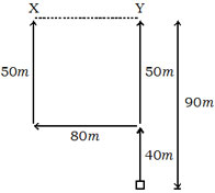 X and Y start from the same point. X walks 40 m north, then turns West and walks 80 m, then turns to his right and walks 50 m. At the same time, Y walks 90 m North. Where is Y now with respect to the position of X ?