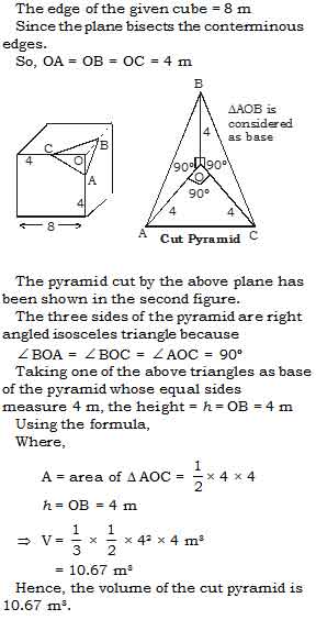 A corner of a cube of side length 8 m, when cut by a plane which bisects the sides of the cube, we get a pyramid whose volume is –
