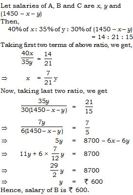 A, B, C together earn Rs.1450 and spend 60%, 65% and 70% of their salaries respectively. If their savings are in the ratio 14 : 21 : 15, the salary of B is –