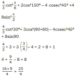 What is the value of   43cot2π6 + 3cos2150º 4 cosec245º + 8sin π2    ?