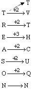 In a certain code language 'POULTRY' is written as 'PRQXNVTY'. How is 'TREASON' written in that code?