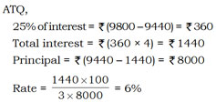 A sum of money amounts to Rs. 9440 in 3 years. If the rate of interest is increased by rate of 25%, the amount becomes Rs. 9800 in same time. Find the principal and rate.