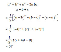 If (a – b) = –4, (b – c) = 7 and (c – a) = –3, then find the value of \(\cfrac{a^3 + b^3 + c^3 -3abc}{a+b+ c}\).