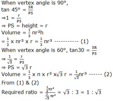 The ratio of the volumes of two right cones with equal base radii but the vertex angles of 90° & 60° respectively is.