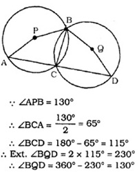 Two circles with centres P and Q intersect at B and C. A, D are points on the circles with centres P and Q respectively such that A, C,D are collinear. If ∠APB = 130° and ∠BQD =  xo, then the value of x is:
