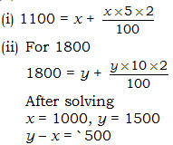 If Rs.1100 is obtained after lending out Rs.x at 5% per annum for 2 years and Rs.1800 is obtained after lending out Rs.y at 10% per annum for 2 years, find y – x.