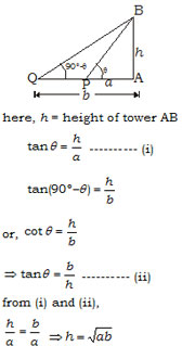 The angles of elevation of the top of a tower from the points P and Q at distances of 'a' and 'b' respectively from the base of the tower and in the same straight line with it are complementary. The height of the tower is