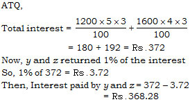 x, y and z are three friends x took loan from y and z of Rs. 200 and Rs. 1600 at 5% per annum and at 4% per annum respectively for 3 years. After the completion of the time x returned the amount with interest to y and z. Being a friend y and z returned 1% of the  interest they received from x. Find the actual interest x paid to y and z.