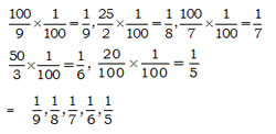 If we convert mixed fraction in to proper fraction we get 100/9 , 25/2, 100/7, 50/3 here we multiply 1/100 to fraction convert in to simple form which make our calculation easy.