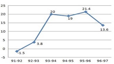 What would have been the exports in crore \(\unicode{x20B9} \)in 1993-94 had the exports in 1991-92 been \(\unicode{x20B9} \)20,000 crores?