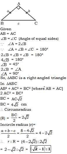 ABC is an isosceles triangle in which AB = AC and ∠A=2∠B, AB = 4 cm. What is the ratio of, inradius to the circumradius?